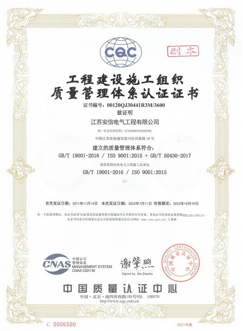 在創(chuàng)業(yè)之初,公司就堅(jiān)持高起點(diǎn)的戰(zhàn)略思路,廣納賢才,集聚行業(yè)精英,創(chuàng)新發(fā)展,做優(yōu)企業(yè)品牌。現(xiàn)已取得:承裝二級(jí)、承修二級(jí)、承試二級(jí),電力工程施工總承包二級(jí),輸變電工程專(zhuān)業(yè)承包二級(jí),建筑工程施工總承包二級(jí),建筑機(jī)電安裝專(zhuān)業(yè)承包二級(jí),地基基礎(chǔ)專(zhuān)業(yè)承包二級(jí)資質(zhì)證書(shū),并通過(guò)了質(zhì)量、環(huán)境、職業(yè)健康和安全管理體系認(rèn)證,確保各項(xiàng)工作有序管控。